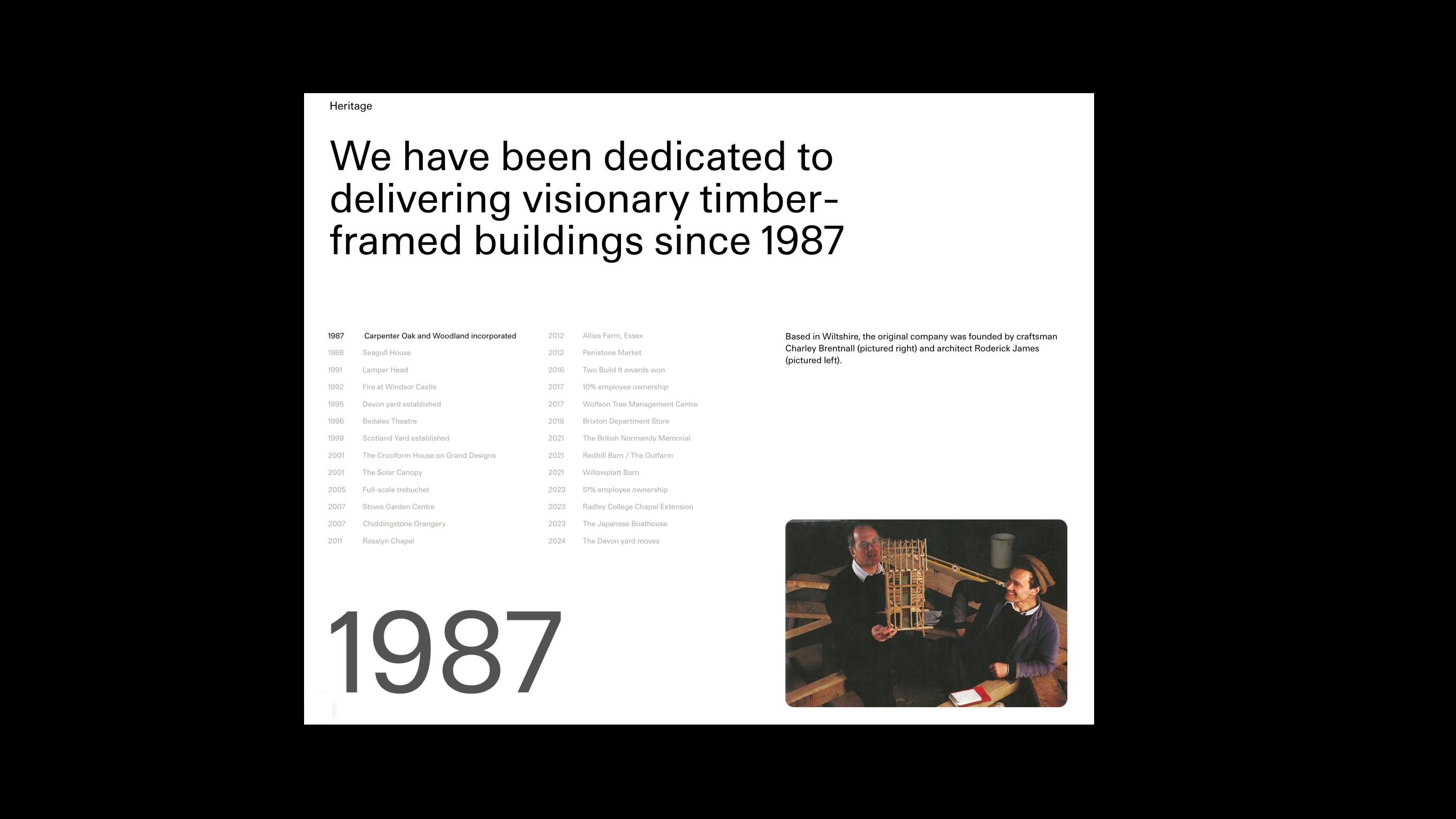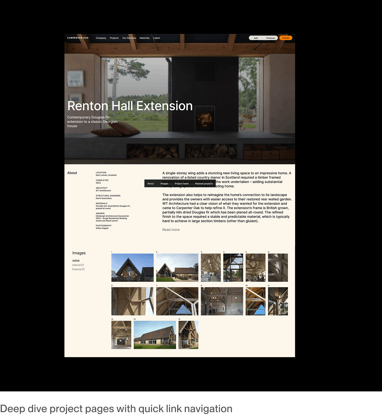 We designed a modular system that gives the Carpenter Oak team flexibility to manage their content and tell their story with impact. Features like the interactive timeline, immersive image galleries make for rich case studies that communicate Carpenter Oaks craft and attention to detail.