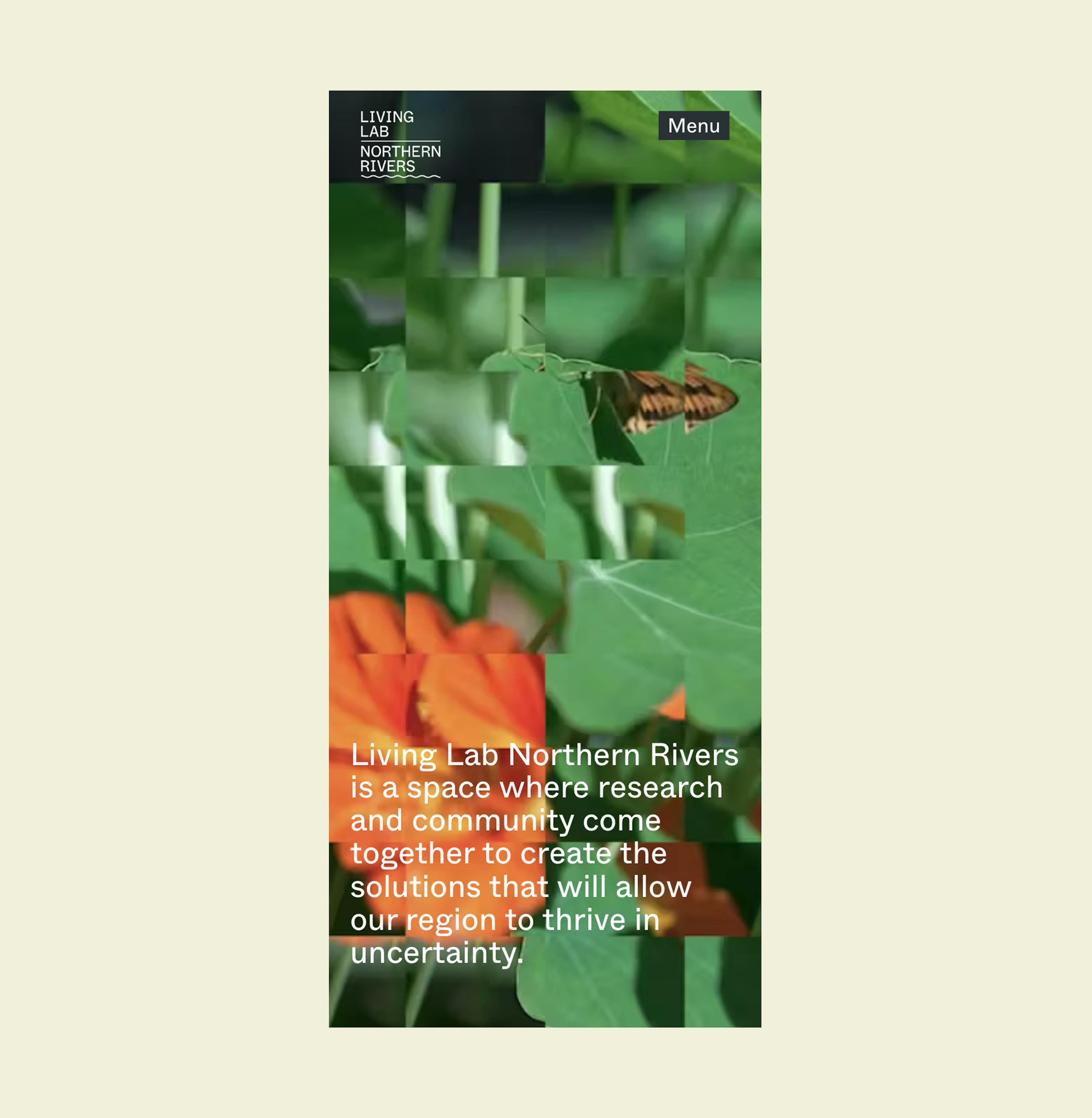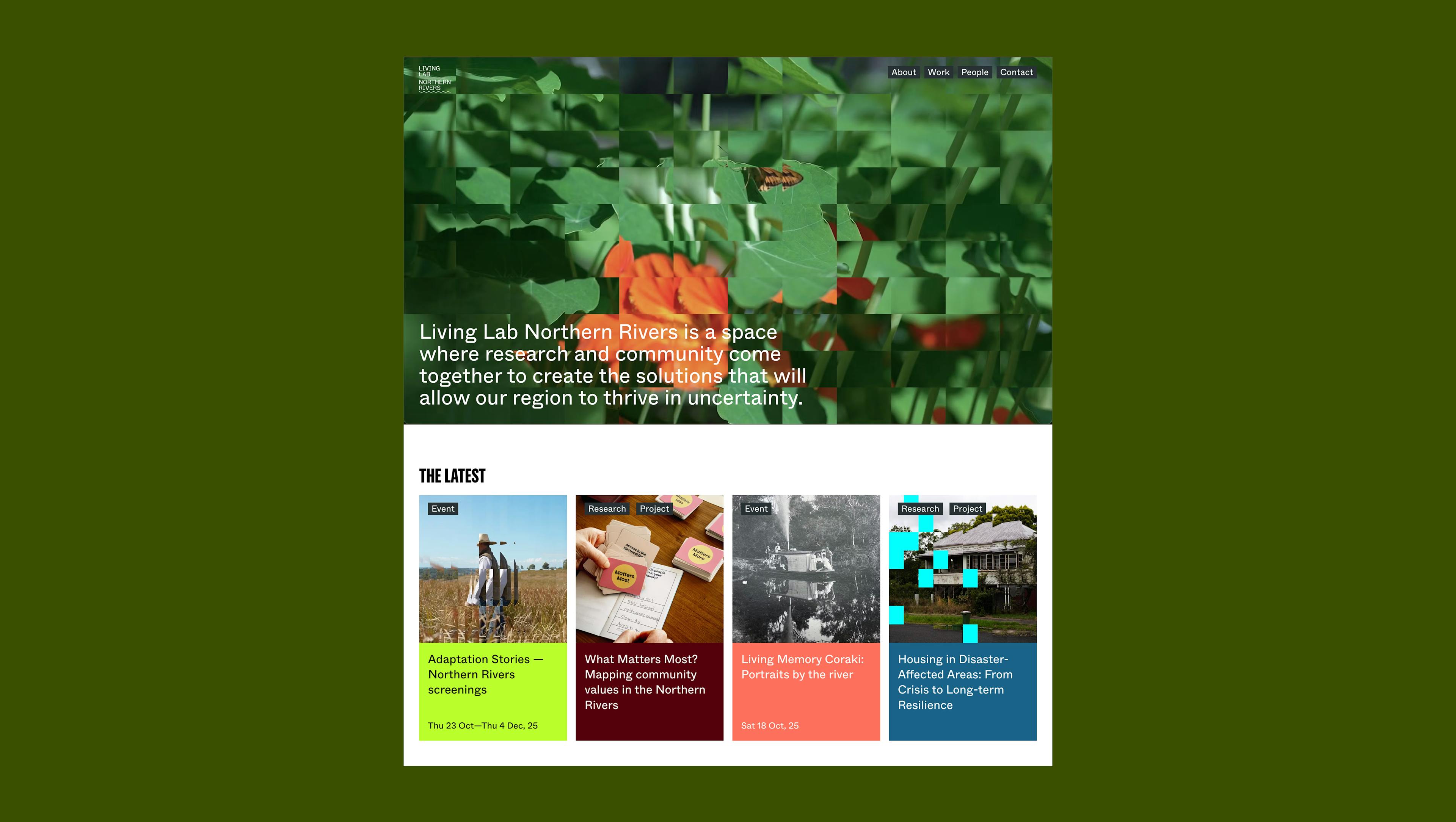 We worked with Living Lab Northern Rivers to design a new website and brand that could grow with them and communicate the important and impactful work they are doing in Lismore. As leaders in the field of research based community future proofing, they needed a platform that was easy to update, clear to navigate, and able to present a wide range of content. Along with a clear brand system that could be implemented coherently by other members of the team after we stepped away from the project.